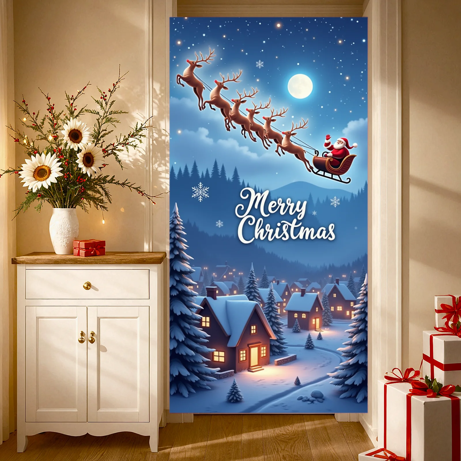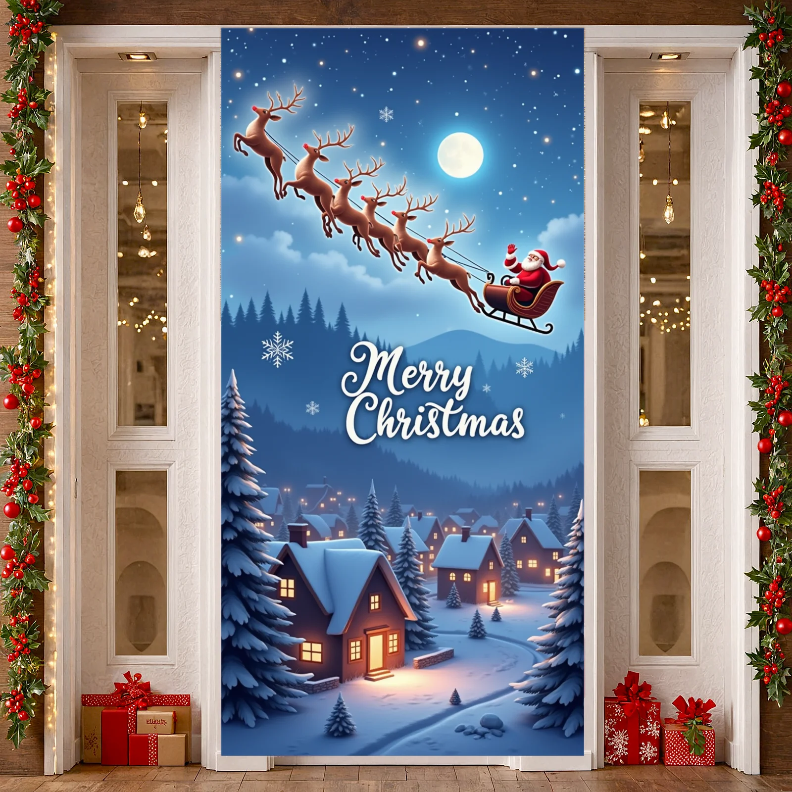 Featuring a beautiful Santa Sleigh, Reindeer, and a Moonlit Snowy Backdrop, this festive decoration is perfect for creating a Winter Wonderland in your home or at your next holiday event. Whether it’s for your Christmas party, family gathering, or as a stunning door cover, this banner will bring warmth and joy to your celebrations.